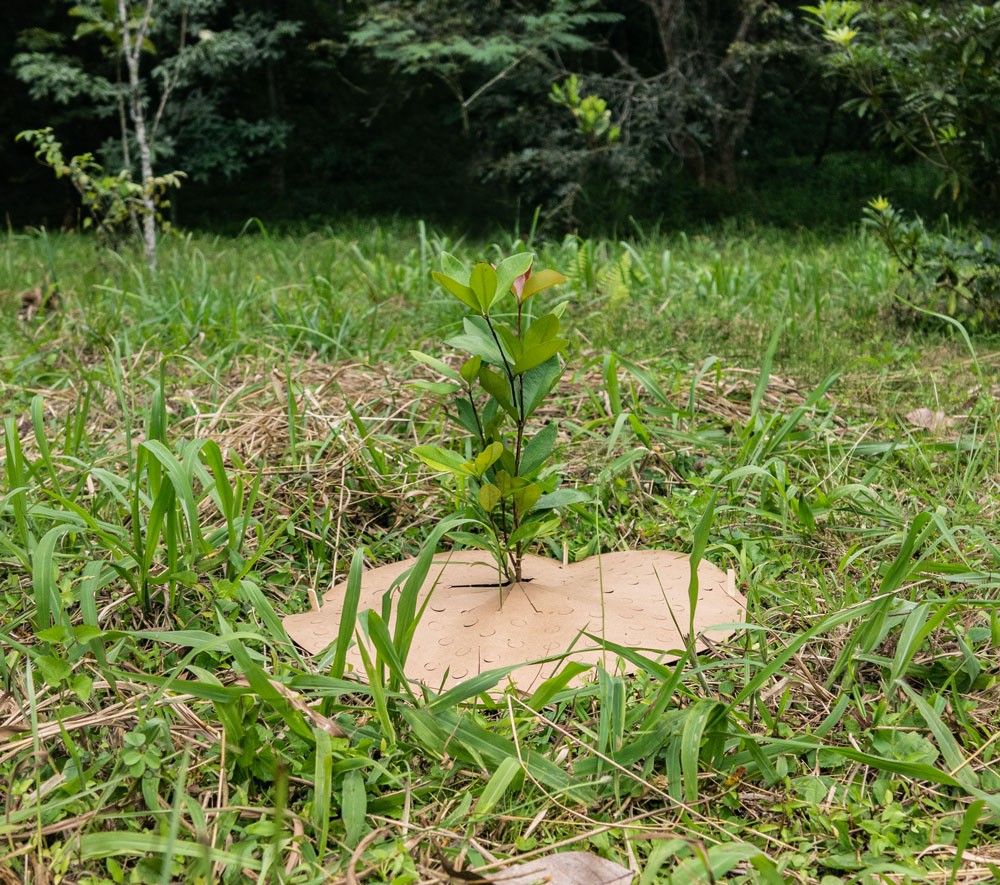 Impede o avanço das gramíneas invasoras e mantém o solo limpo ao redor da muda.